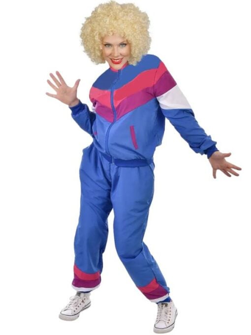 Our tracksuit is crafted from non-stretch polyester parachute-style material. Thus ensuring a comfortable fit while you bust out those epic dance moves. Firstly, The costume jacket features a striking blue color. Adorned with eye-catching red, white, and purple color-blocked stripes on the chest and arms. It’s a bold statement that screams retro fabulousness! The matching parachute-style pants follow suit, with their blue base and lively purple, red and white stripes at the leg.