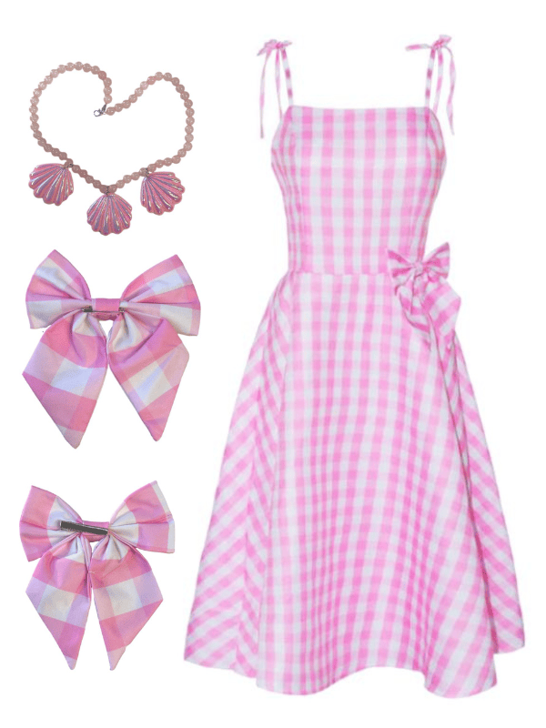 Complete the look with not one, but two pink gingham bows – one to adorn your hair and another to pin gracefully onto the dress. With these delightful accessories, you’ll embody the true essence of Barbie’s fashion-forward spirit.