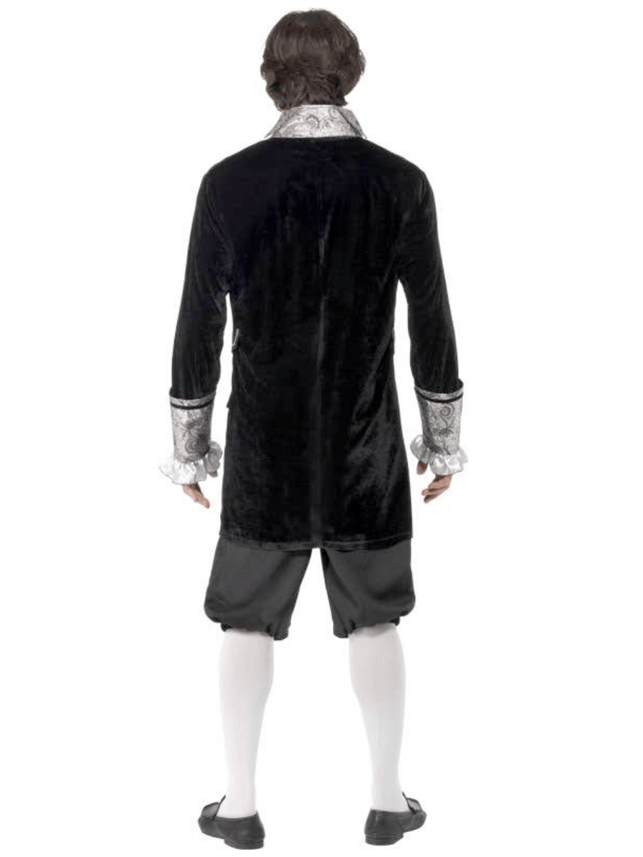 The long black velour-look jacket is the highlight of this ensemble, featuring dramatic silver brocade detailing on the collar, lapels, and cuffs, while attached silver satin sleeve ruffles add a touch of decadence. The look is completed with black ¾-length pantaloon trousers with an elastic waist, allowing for both comfort and movement. A silver paisley-print cummerbund cinches the waist, and a four-layered silver satin jabot ties elegantly at the neck, creating the ultimate baroque vampire aesthetic.