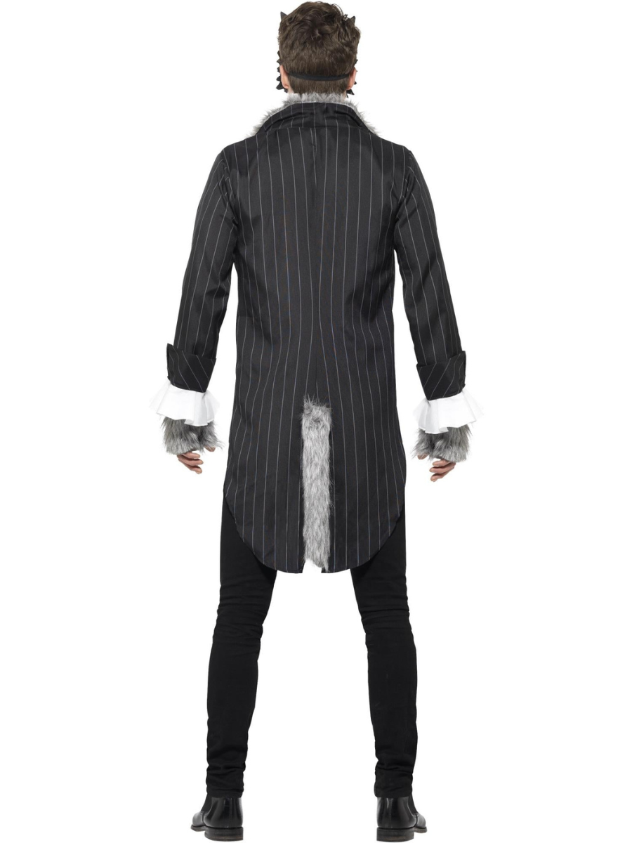 To enhance your transformation, the costume includes grey furry gloves for clawed hands and a detachable grey fur tail that attaches effortlessly to the jacket. The true pièce de résistance is the silver and black half-face wolf mask, featuring a snarling snout and sharp teeth, secured with an elastic band for a comfortable fit.