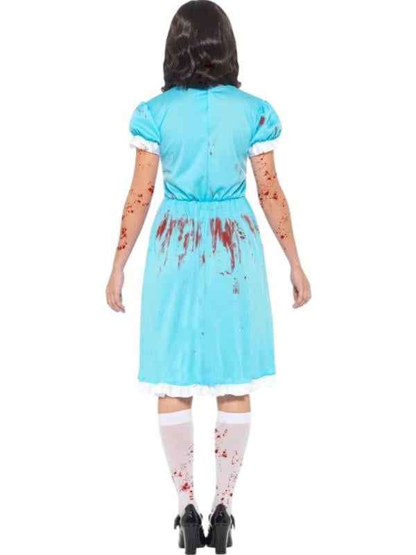 The dress is the centerpiece of this outfit and is designed to give you that unmistakable twin look from the film. Covered in blood stains, it adds a gruesome and unsettling touch to your appearance. The white collar and frill trim at the hem and on the short puff sleeves provide a creepy contrast to the otherwise innocent design.