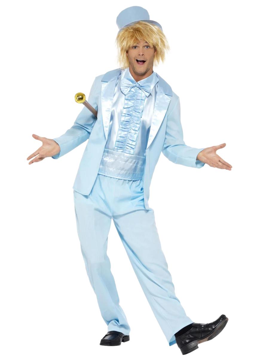The Blue Dumb and Dumber Costume includes a powder blue jacket with a satin lapel, matching trousers with an elastic waist for a comfortable fit, and a ruffled satin shirt front that secures easily around the neck. Completing the look is a matching blue hat, giving you that full Harry Dunne style straight from the big screen. Made from lightweight polyester, this suit is designed for easy wear and maximum fun.