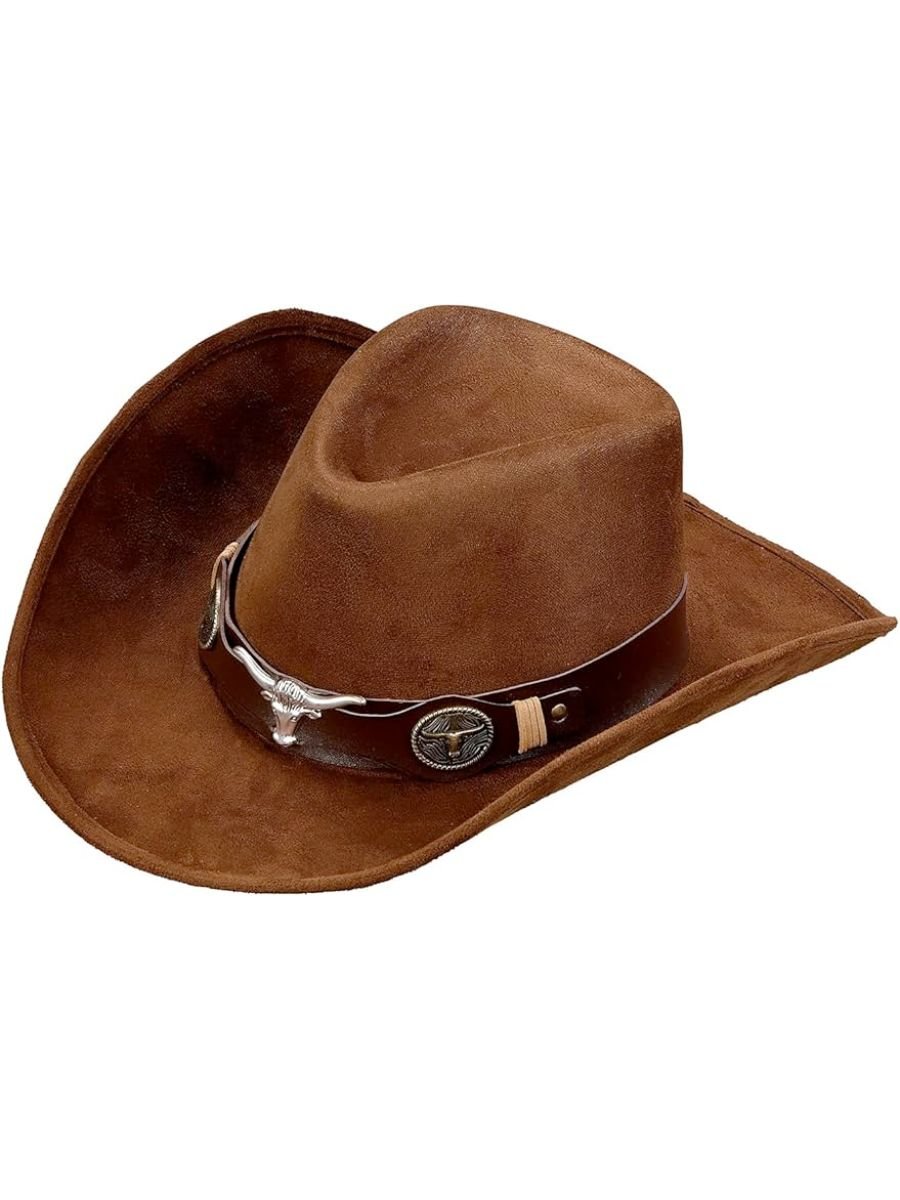 Saddle up and complete your cowboy look with our Brown Rodeo Cowboy Hat, crafted to bring a touch of the wild west to any costume. Made from rich brown faux suede, this deluxe hat features a classic upturned brim on each side, giving it that authentic cowboy silhouette. The brown leather-style hatband adds sophistication, while the silver bull emblem and brass-embossed bull accents provide eye-catching detail that screams rodeo-ready.
