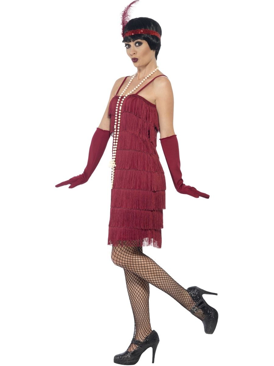 The costume features a stunning burgundy red dress adorned with layers of swaying fringe that move beautifully with every step. Its sleek design captures the flirty and fun essence of the decade. Complementing the dress is a matching sequined headband, complete with an elegant feather that adds a touch of sophistication to your ensemble. Elbow-length burgundy red gloves complete the look, lending a refined and polished flair to your outfit.