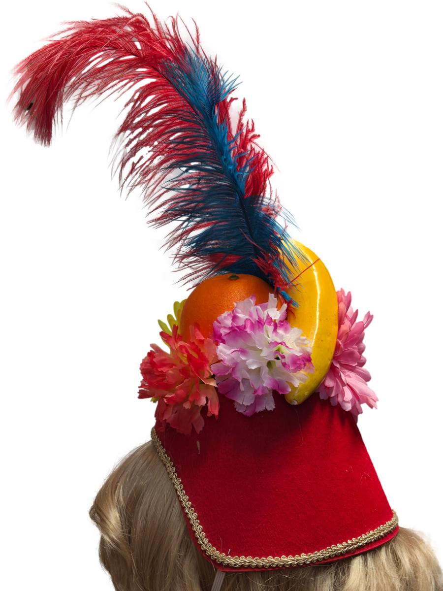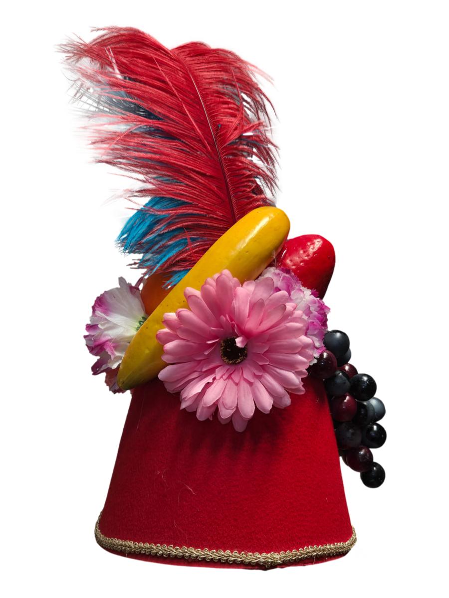 Exclusively handmade, this hat is one-of-a-kind—you won’t find anything like it anywhere else! Designed with a bold red fez-style base, it features gold trim, a vibrant plume of colored feathers, an assortment of artificial flowers, and a playful selection of faux fruit. Each hat includes two feathers, a bunch of grapes (green or purple), a banana, and two additional pieces of fruit, ensuring a unique and eye-catching look. The hat is secured with a comfortable white elastic band, keeping it in place as you dance the night away.