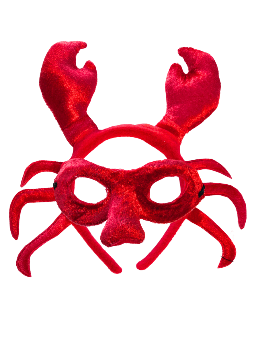 The Crab Headband and Mask set includes a sturdy plastic headband wrapped in soft red velour fabric, topped with oversized padded crab claws that stick up for a delightfully crabby look. Also included is a matching red eye mask, also covered in velour fabric, shaped to fit comfortably and secured with a black elastic strap so you can scuttle around with ease.