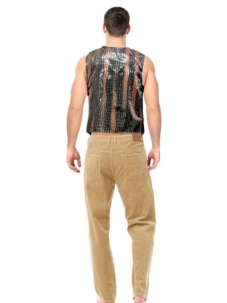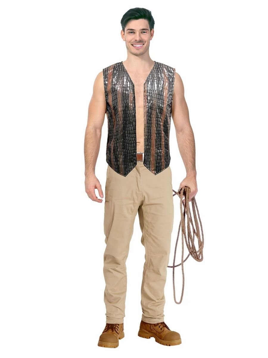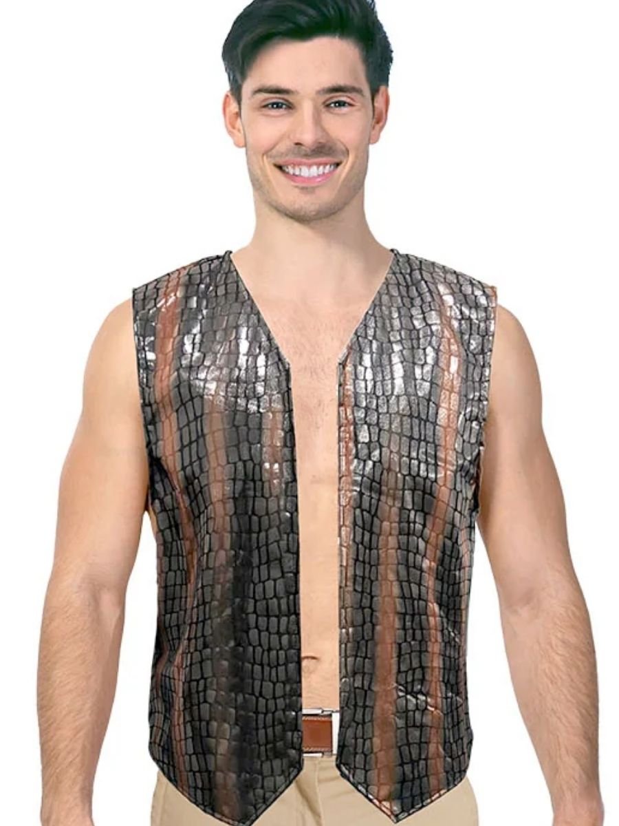 The star of this look is the sleeveless crocodile print vest, made from lightweight faux leather-look fabric. It has a subtle sheen and textured finish to give it that worn-in, rugged feel. The vest is designed to be worn open over your own shirt—or no shirt at all if you’re really embracing that outback bravado.
