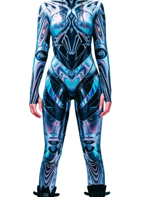 The Cyberpunk Cyborg Costume features a full-body, stretchy lycra jumpsuit with a sleek all-in-one zip-up design. Its 3D sublimated print creates a holographic, armor-like effect that catches the light and gives you that high-tech, sci-fi vibe. With long sleeves, open hands, and thumb loops, it’s comfortable, flexible, and perfect for dancing, performing, or striking dramatic poses. The stand collar and full-length legs complete the bodycon silhouette, delivering an effortlessly edgy look.