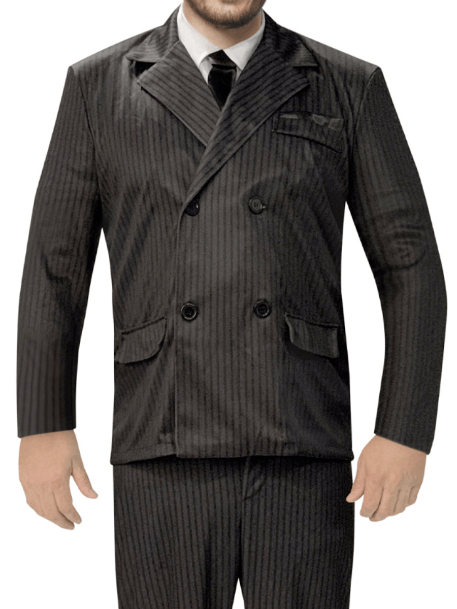 Firstly, our officially licensed Deluxe Gomez Addams Costume includes a jacket with a stripe print and a double-breasted front. You’ll also receive a separate grey cotton mock shirt front with a satin faux necktie and a convenient back velcro closure. To complete the ensemble, matching suit pants with a printed pique stripe, an elastic waist, and a faux fly. Please note that shoes are not included.
