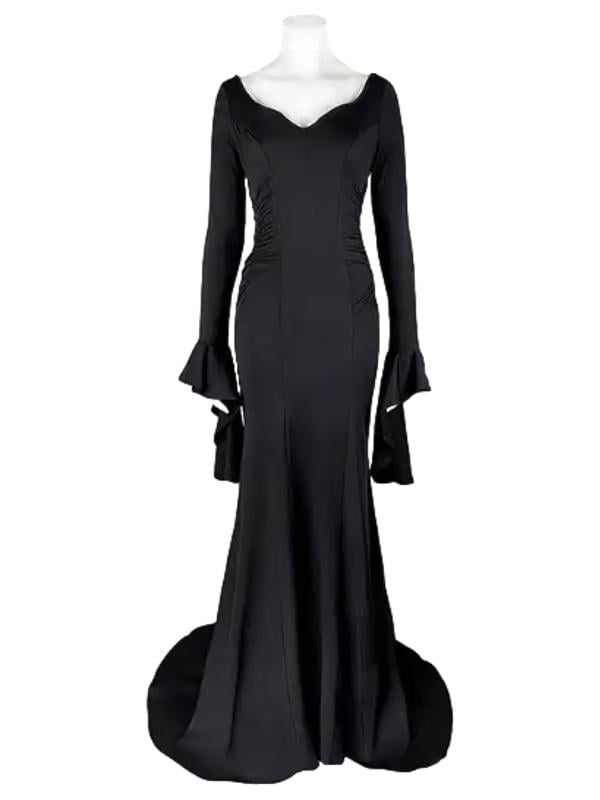 This Morticia costume is a tribute to her iconic style. Firstly, it features a floor-length black gown with long sleeves and a long, flowing train that pools gracefully behind you. The gown captures Morticia’s essence perfectly, Thus allowing you to step into her shoes and become the lady of the Addams mansion.