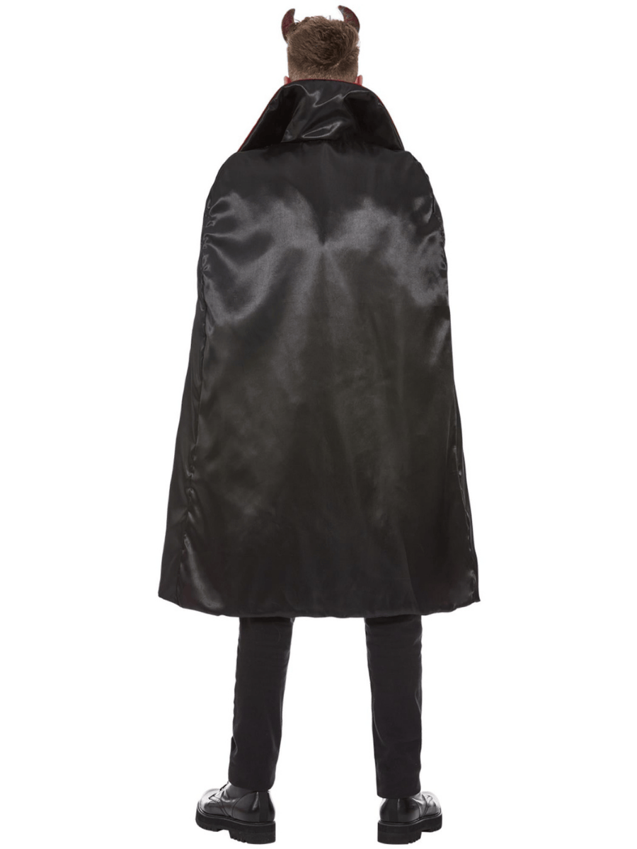A long, flowing black cape with red satin lining and an exaggerated stand-up collar ties at the front and brings theatrical flair to the outfit. Completing the ensemble is a plush black headband with curved grey velvet horns and eerie blood splatter detailing for that freshly risen-from-hell aesthetic. Available in men’s medium, large, and XL sizes, this devil costume is a wickedly good choice for Halloween, Lucifer-inspired characters, or even a vampire twist—just swap out the horns for fangs and you’re set.