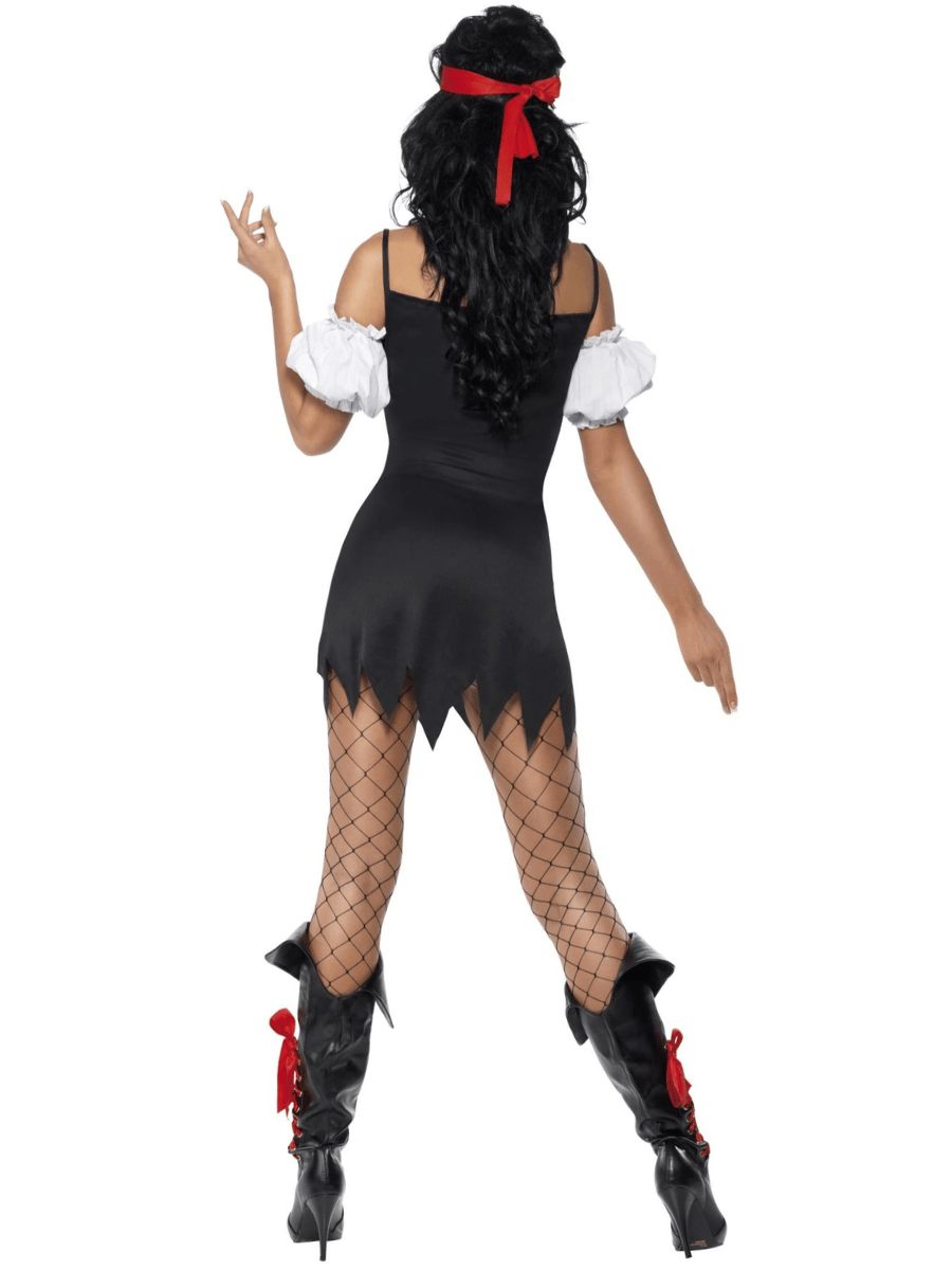 Firstly, the heart of this Fever Pirate Costume ensemble is a striking black dress. Adorned with captivating red and white striped detailing on both the chest and skirt. The dress sets the tone for a pirate queen ready to commandeer any ship with flair. The look wouldn’t be complete without the detachable white puff sleeves, adding a touch of elegance to your high-seas persona.