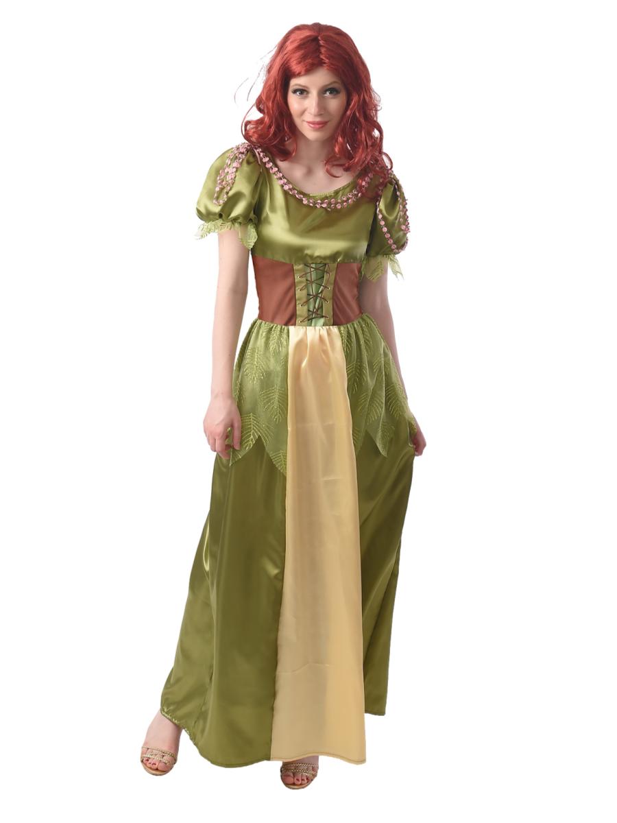 The costume features a floor-length green satin dress that glistens with every movement. It includes an under-bust faux corset, accentuating your silhouette while adding a touch of medieval flair. The organza leaf peplum and pretty pink rosebud detail further enhance the whimsical look, making you feel like a true woodland fairy.