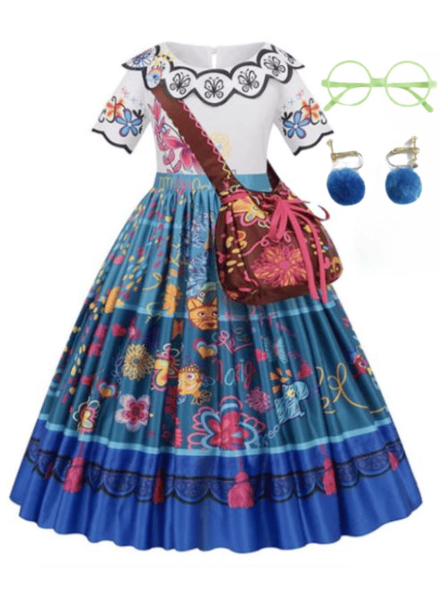 Our Mirabel Costume features a stunning dress that is sure to captivate everyone’s attention. With its full printed skirt and ruffled neckline, it perfectly captures Mirabel’s adventurous spirit and vibrant personality. The costume also includes round green glasses, adding a playful touch to the ensemble. Complete the look with the included brown bag, perfect for storing magical treats, and fluffy clip-on earrings for that extra touch of charm.