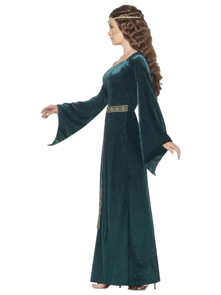 The costume features a stunning floor-length green velour dress, exuding a regal charm. The attached gold belt adds a touch of royalty, accentuating the waistline for a flattering silhouette. The billowing sleeves and round neckline evoke the classic medieval style, ensuring you stand out at any event.