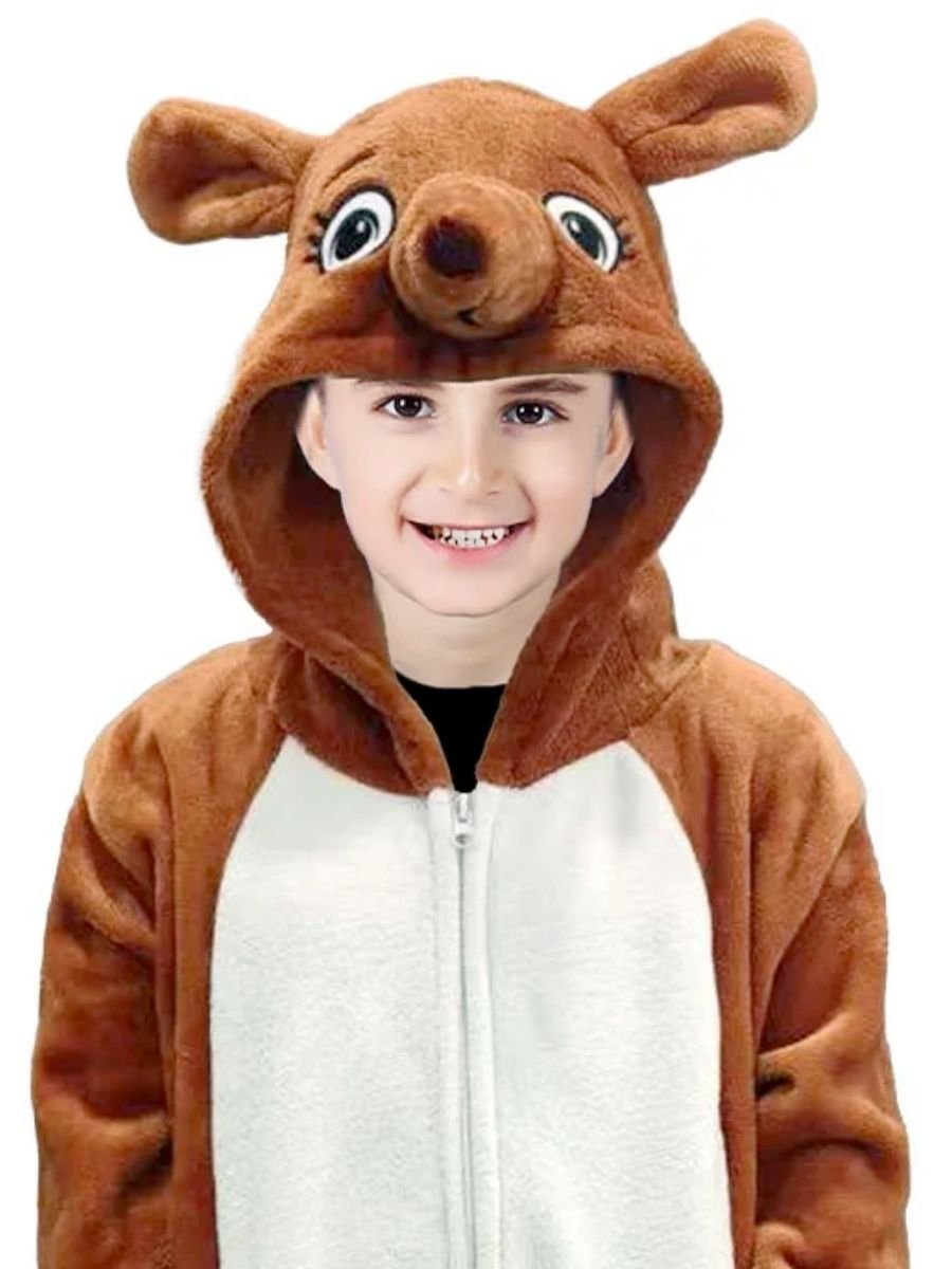 Made from a soft-touch brown polyester fabric, this all-in-one hooded jumpsuit is designed with comfort and imagination in mind. The zip-up front makes dressing a breeze, while the attached tail and front pouch pocket bring the character to life. The hood features an adorable kangaroo face with floppy ears, giving your child that unmistakably Aussie kangaroo charm.