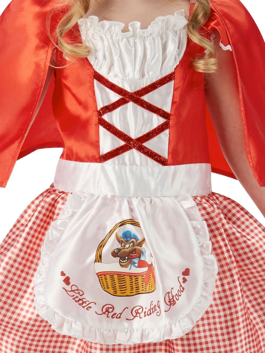 The Kids red riding hood costume features a beautifully detailed dress with a satin-panelled bodice, ruched upper section, sewn-in belt, and sparkling glitter crossovers. The skirt combines gingham and satin with a sweet frill hem, while the attached apron adds a charming touch with a glitter-printed name and motif. A red satin cape with an attached hood and velcro fastenings completes the classic look.