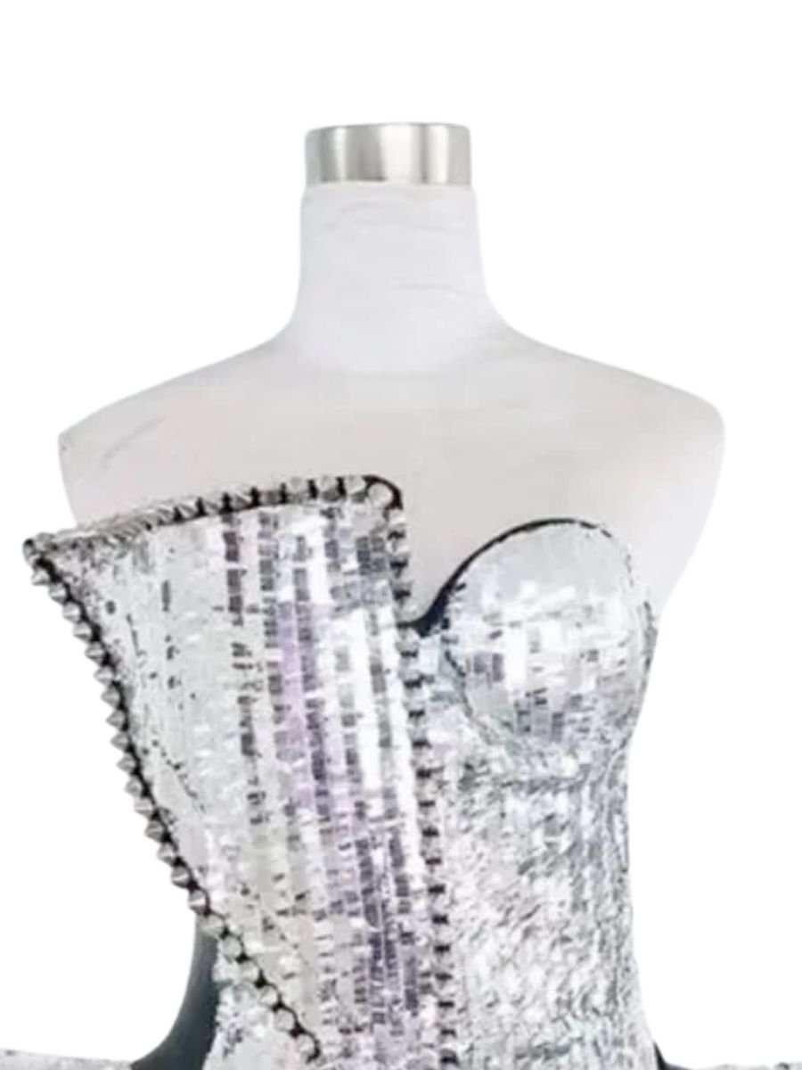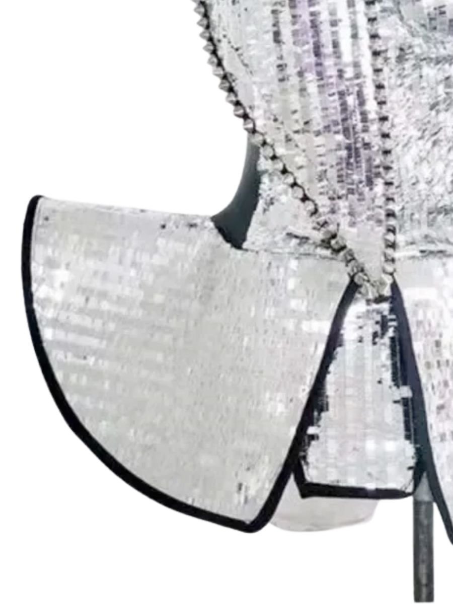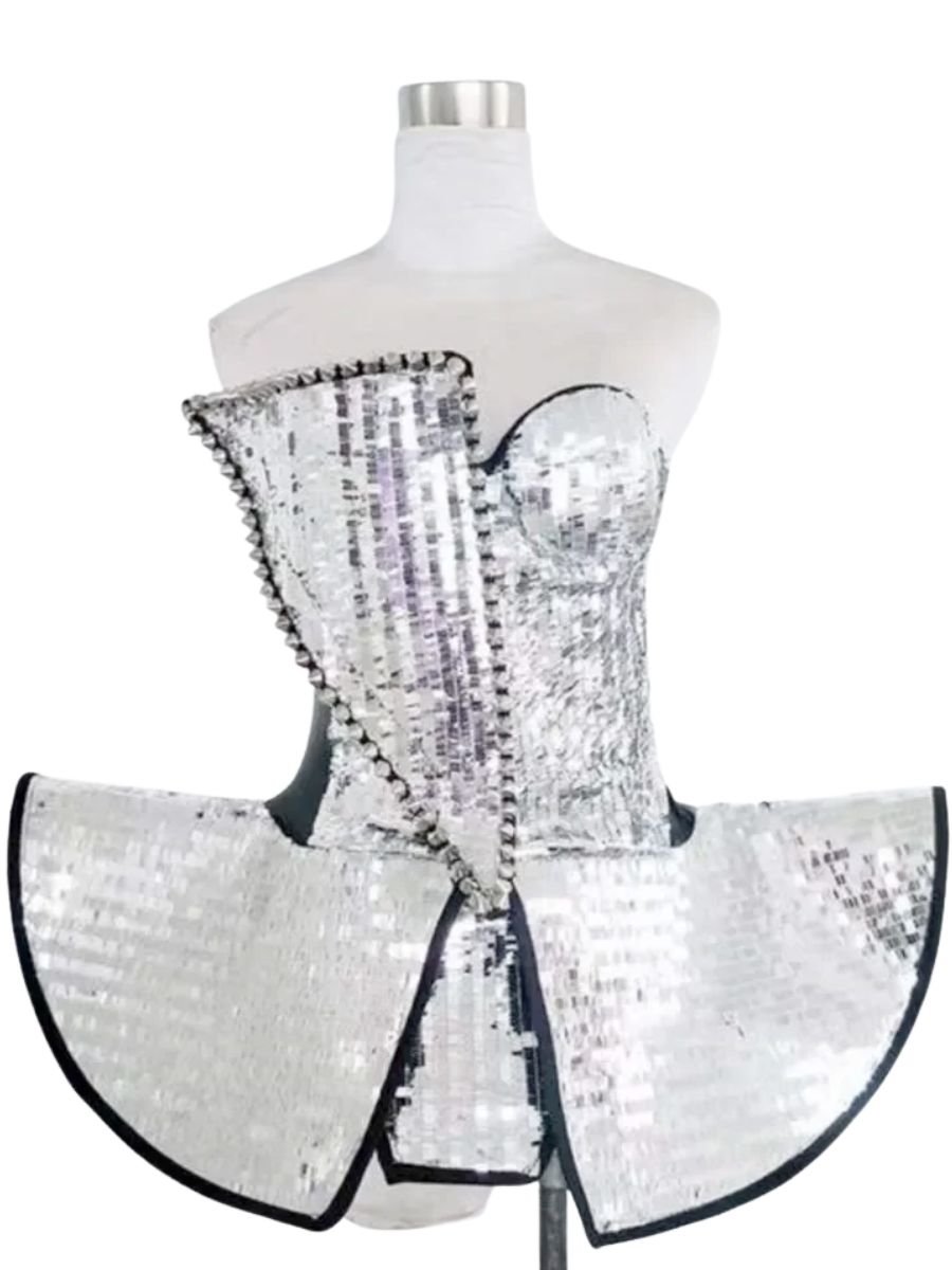 The Lady Gaga Silver Costume features a sparkling silver sequined geometric dress with built-in shorts for comfort and movement, along with detachable clear straps to give you multiple styling options. Its modern, stage-ready design captures the essence of Gaga’s legendary performances, letting you channel her fearless, fashion-forward energy wherever you go.