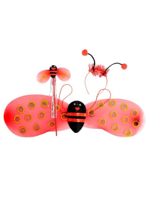 Our Ladybird Accessory Set includes everything you need to create a buzzing look: vibrant red ladybird wings, a playful ladybird antenna headband, and a darling ladybird wand with fluttery tassels. The wings measure 20 cm in height and 68 cm across, adorned with bold black spots and shimmering gold accents. You’ll feel like you’re ready to take flight with these eye-catching wings!