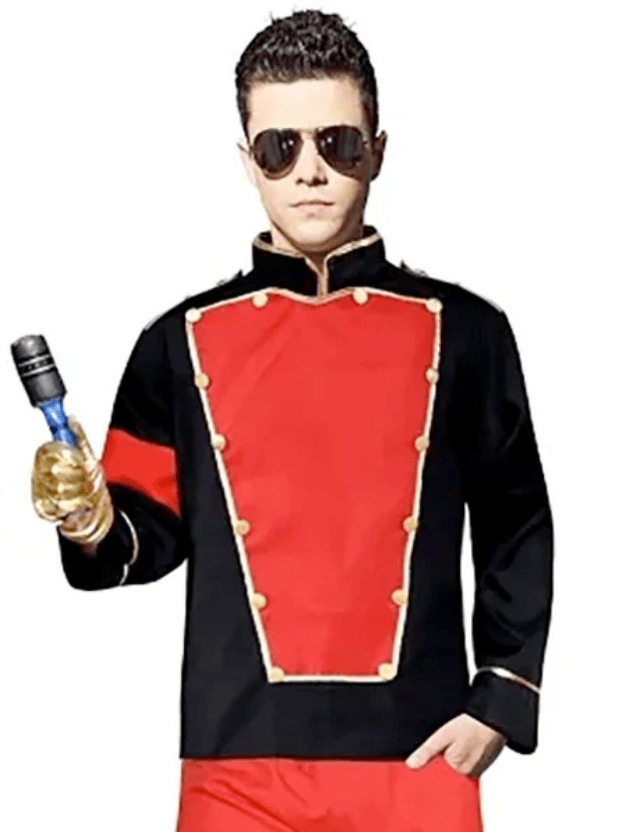 The costume boasts a striking red and black faux jacket, featuring a convenient zip-up back, gold buttons, and trim that scream MJ’s signature flair. Complementing this are the bright red trousers that are both bold and stylish. But that’s not all – a glimmering metallic gold glove and an inflatable microphone complete the ensemble, ensuring you’re ready to hit the stage in true Michael Jackson fashion.