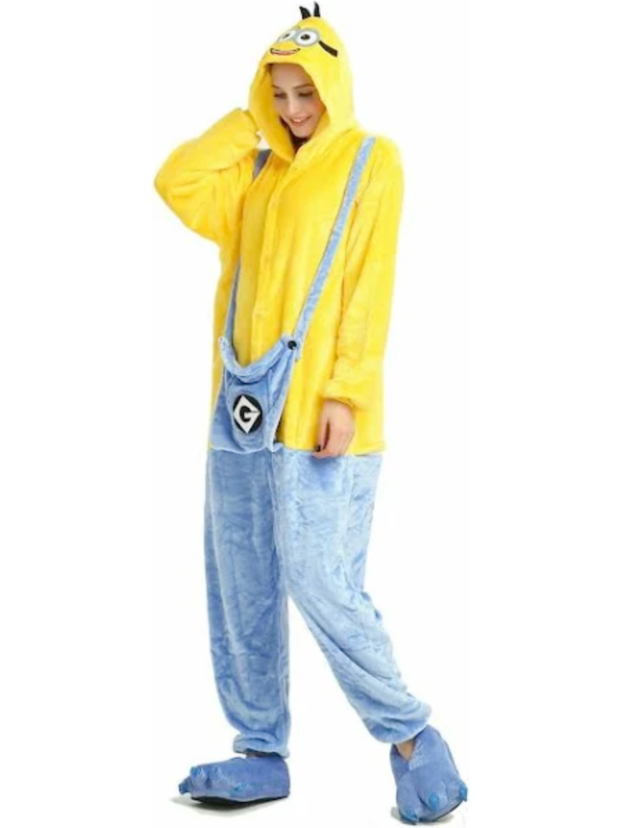 Designed for comfort and convenience, this onesie features the signature yellow and blue Minion look, complete with an oversized hood that showcases embroidered Minion eyes, goggles, and a big, toothy grin. A tuft of felt hair on top adds that extra authentic touch. The onesie includes a handy front zipper closure for easy wear and a front pocket stitched onto the chest—perfect for carrying a few sneaky snacks or your phone. Elasticized wrists and ankles provide a snug, comfortable fit so you can party or relax in style.