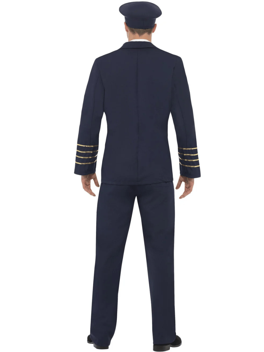 The costume features a distinguished navy blue jacket adorned with double-breasted-style golden buttons and intricate gold braiding around the cuffs, adding an air of authority to your look. Coordinating navy trousers with an elasticated waist ensure both comfort and authenticity. Top it off with the iconic peaked pilot’s cap to complete your transformation into a seasoned aviator.