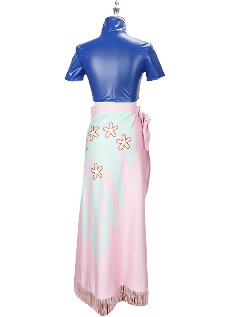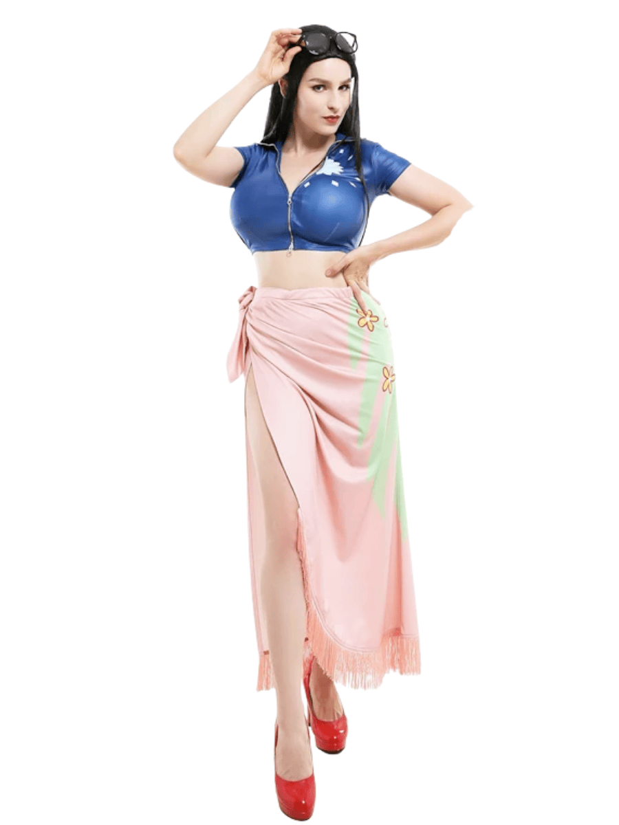 The Nico Robin Costume includes a sleek, satin look blue zip-up crop top with short sleeves, featuring a white floral-style symbol on the front—just like Robin’s. Paired with it is a vibrant wrap-style maxi skirt with a tropical floral print and pink fringed hem, giving the look that signature island flair she’s known for.