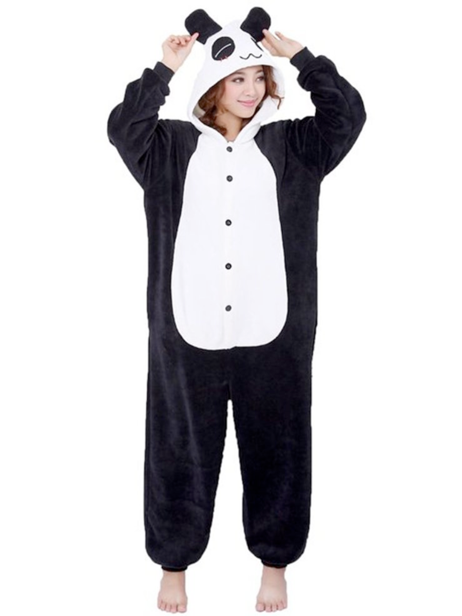 The all-in-one hooded jumpsuit features a button-up front for easy wear and an embroidered panda face with ears on the hood for an authentic and playful touch. The back of the onesie includes a funny little panda tail, adding to the charm. With its oversized fit, this costume is as comfortable as it is adorable—ideal for staying warm and snuggly during cooler months.