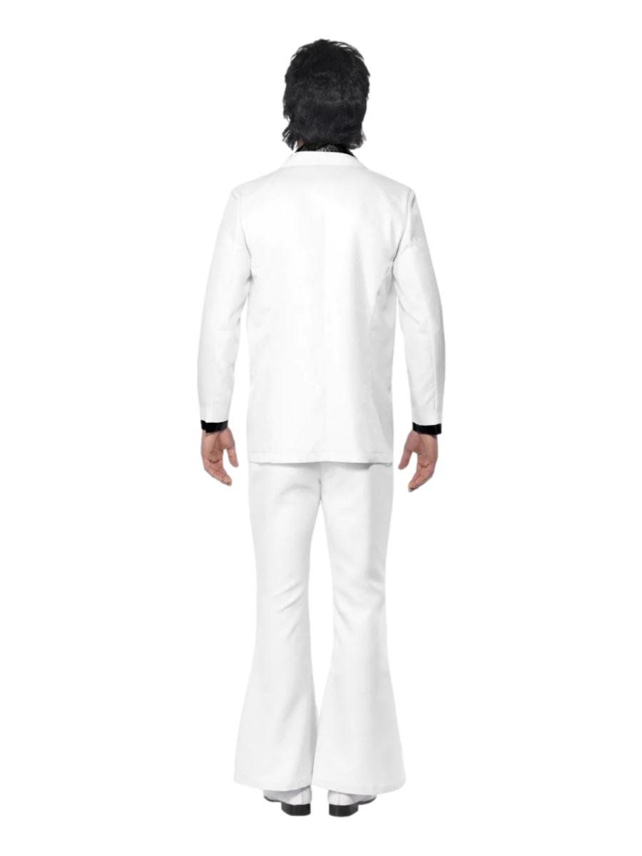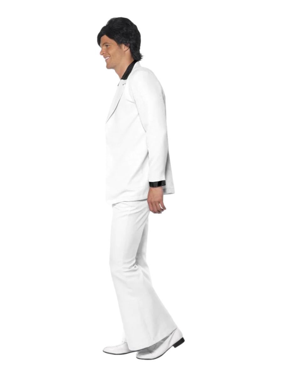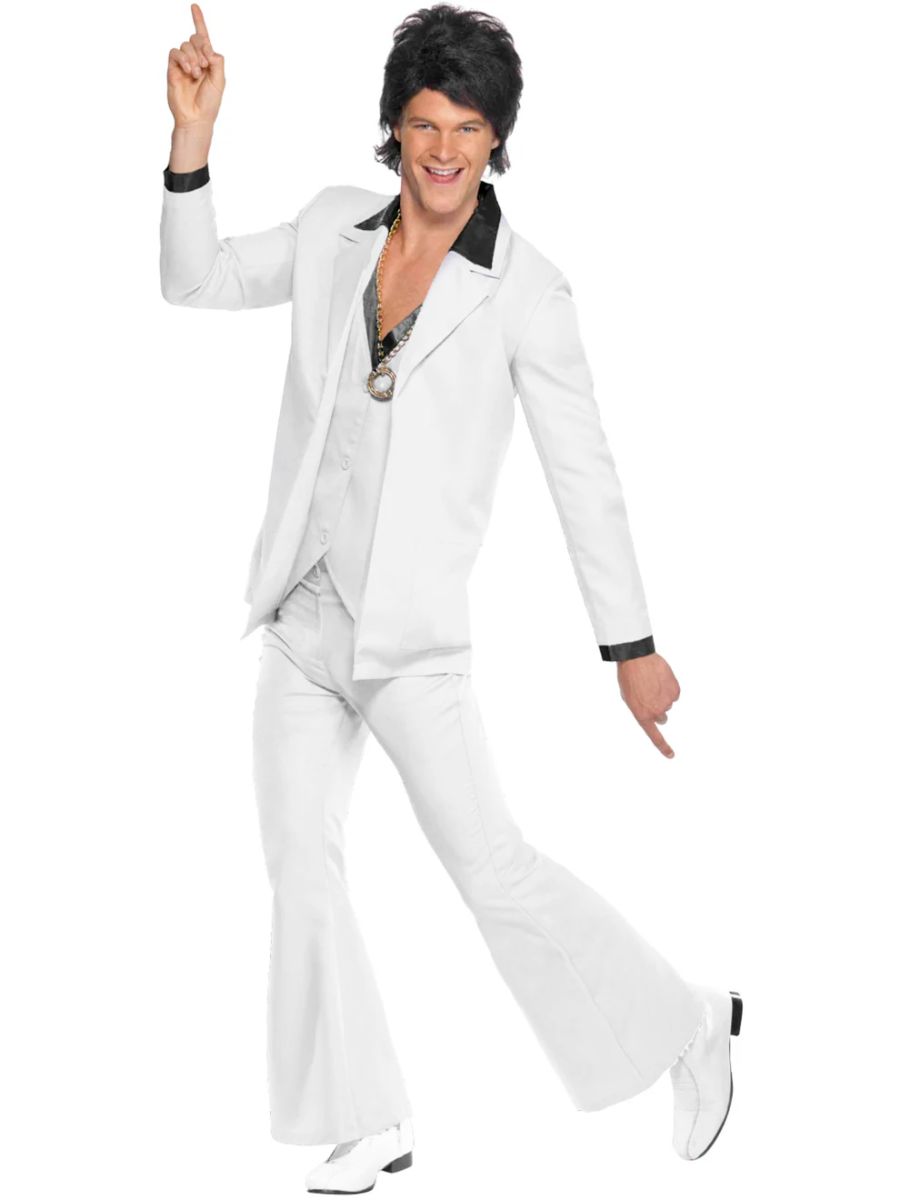Feel the rhythm of the music as you strut your stuff in this iconic Saturday Night Fever Costume ensemble. The costume features a stylish white jacket with an attached black mock shirt and waistcoat. Thus exuding retro charm and disco vibes. Paired with matching white flared trousers.. You’ll be ready to unleash your inner John Travolta and dance the night away in true 70s style.
