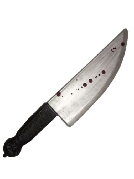 Crafted from durable silver plastic, this fake butcher knife meticulously features a chillingly realistic appearance. What sets it apart is the convincingly sinister fake blood splatter. Thus ensuring that your Halloween ensemble is truly bloodcurdling.