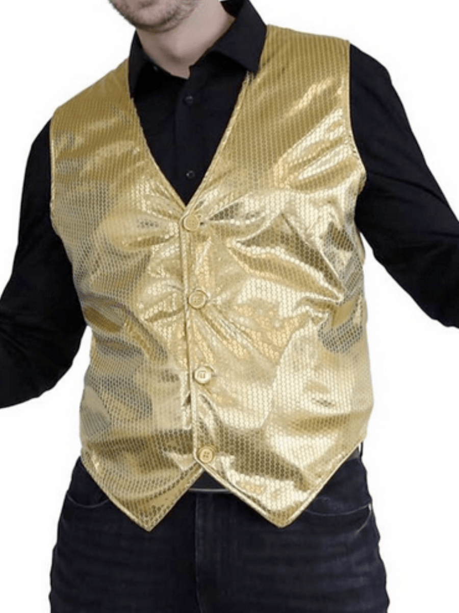 Step into the spotlight with our dazzling Men’s Sequin Gold Vest! Designed to bring glitz and glamour to any event. Whether you’re channeling your inner ringmaster, adding flair to a cabaret performance.. Or making a statement at a Vegas-themed party, this vest ensures all eyes are on you.