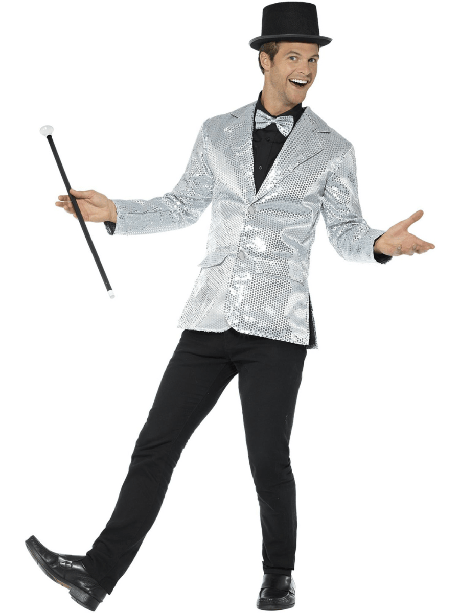 This sequin jacket is incredibly versatile—pair it with a matching silver bow tie and waistcoat for an elegant, coordinated look, or add a top hat and cane to transform into a dazzling showman or entertainer. Want to switch things up? Use it as part of a circus ringmaster costume, a Vegas showman outfit, or even a retro 80s or disco-themed ensemble.