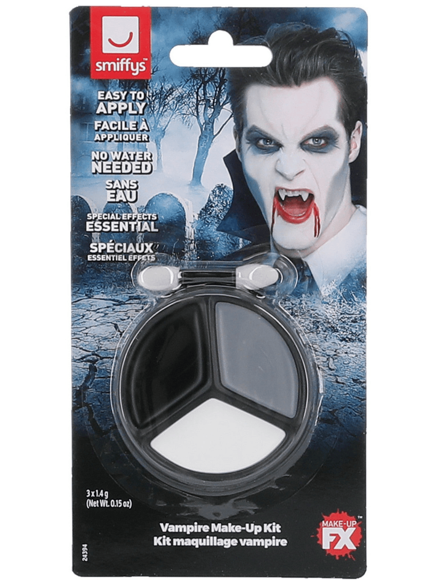 This compact face paint kit includes three perfectly coordinated greasepaint shades—black, grey, and white—designed to help you contour, highlight, and shadow your face into a chilling vampire visage. The creamy, blendable texture makes it simple to apply and layer for dramatic effect, whether you want sunken cheekbones, eerie under-eyes, or a ghostly pallor. An included applicator brush allows for precise detail work so you can sharpen your features or add subtle depth with ease.