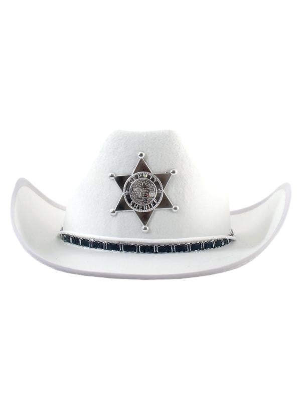 Ride into the sunset in style as you don this fabulous white cowboy hat. The silver plastic sheriff badge decoration adds an extra touch of authority to your cowgirl look! While the decorative black and silver band brings an element of elegance. So, get ready to turn heads and make a grand entrance wherever you go!