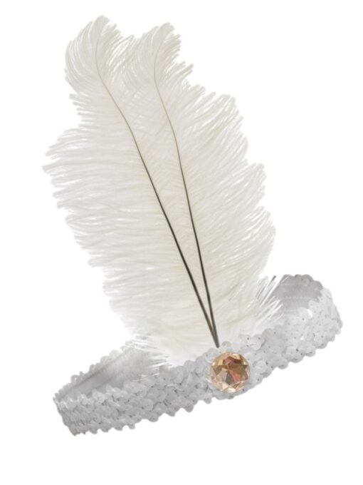 Get the Gatsby look instantly with this stunning 1920s style feather headpiece. The headband features elegant white feathers and a large silver gemstone, all elegantly mounted on an elasticated white sequin band. Designed to fit most head sizes comfortably, it’s the perfect finishing touch for adding vintage flair to any outfit.