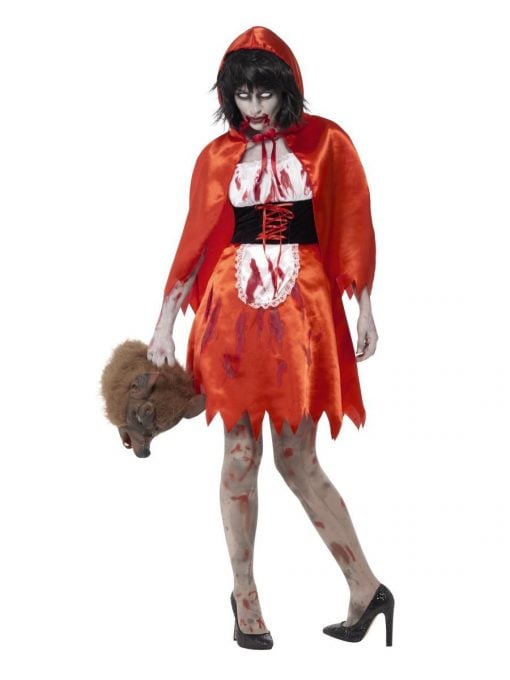 Turn the beloved fairy tale on its head with this spine-chilling Zombie Red Riding Hood Costume. Perfect for Halloween.. This gruesome twist on a childhood classic transforms sweet Little Red into an undead nightmare who roams the woods with more than just a basket of goodies.
